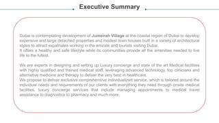 The document proposes developing a luxury healthcare facility called Jumeirah Village in Dubai to attract expatriates and tourists. It will offer a safe lifestyle with onsite medical facilities, luxury concierge services, and nursing support available 24/7. This will include telemedicine, medical procedures and travel assistance, emergency management, and recreational activities. The project will require space, equipment, and support services from a facility management company to deliver comprehensive individualized healthcare and wellness services tailored to client needs.