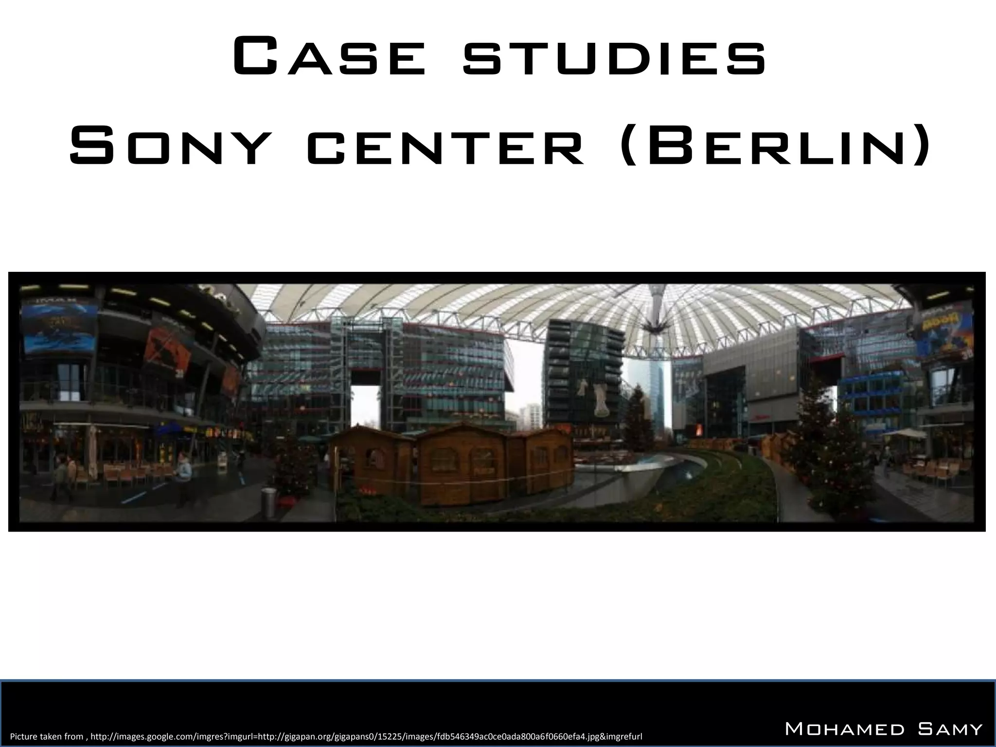 The document provides information about the Sony Center in Berlin, Germany. It is located between two major tourist attractions in Berlin - the Berlin parliament building and the Brandenburg Gate. The Sony Center contains a mix of shops, restaurants, offices, museums, and entertainment venues. It has a central plaza area covered by a unique tent-like structure. The building aims to create a lively, sustainable environment for visitors through features like double-glazed skin, a central public space, and indoor/outdoor integration.