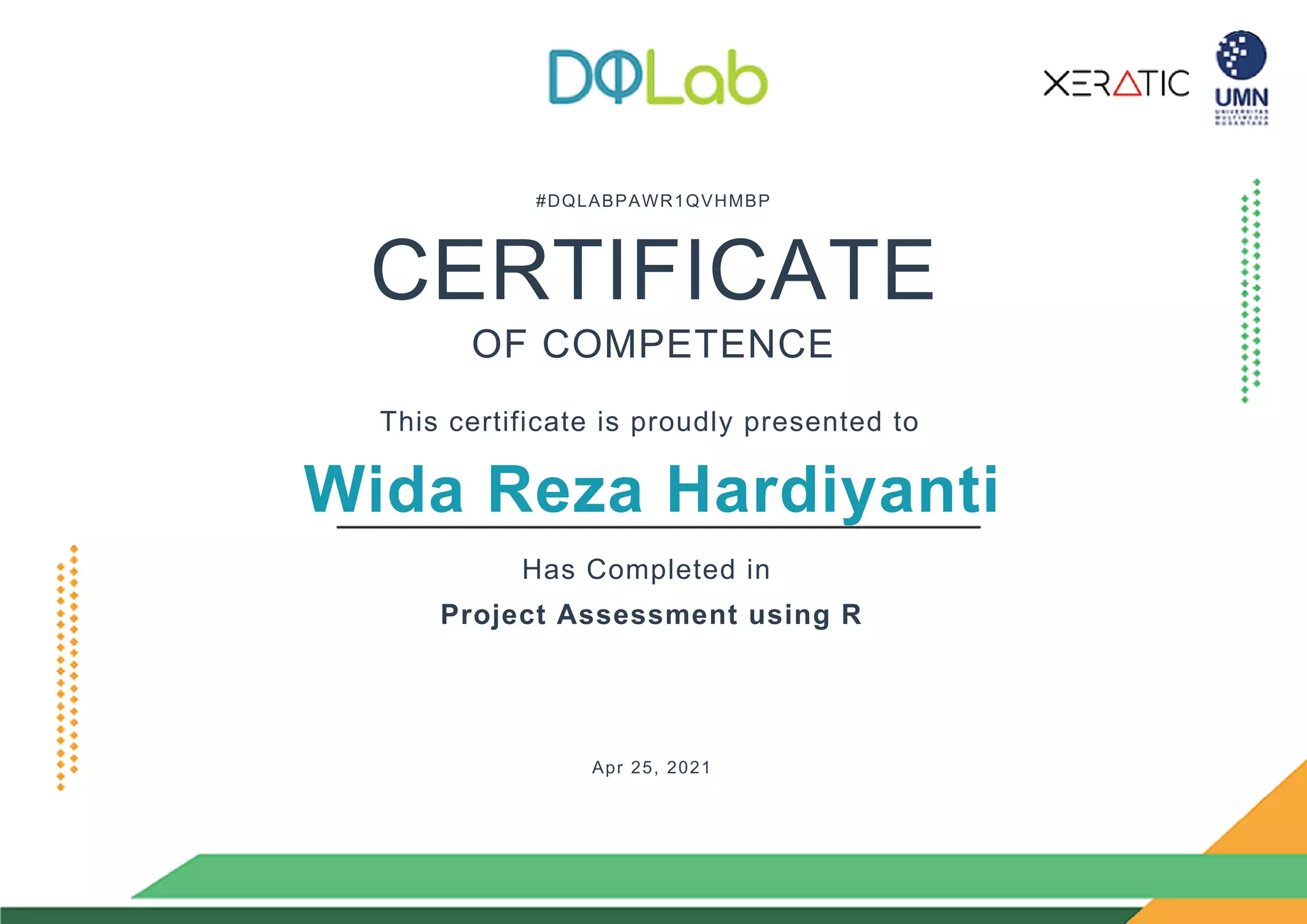 This certificate is presented to Wida Reza Hardiyanti for completing a Project Assessment using R on April 25, 2021. It certifies her competence in this area. The certificate number is #DQLABPAWR1QVHMBP.