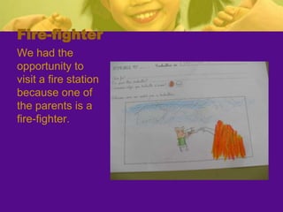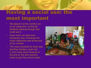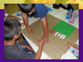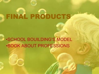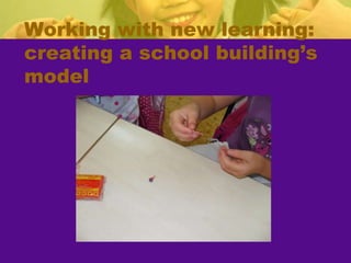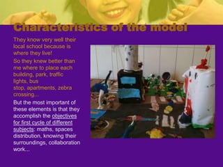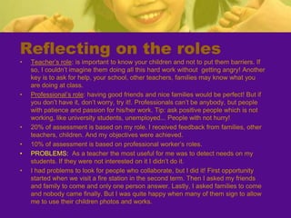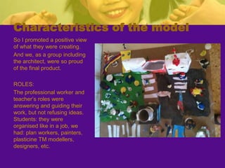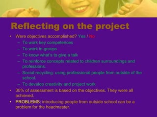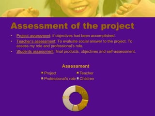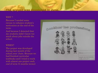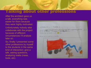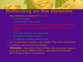 The teacher developed a project called "Learning About Professions" to motivate second grade students and help them learn about jobs outside of school. The teacher invited professionals to give talks to the students about their work. An architect visited the class and talked about her job, showed tools, and helped the students build a model of their school. The students learned about other professions and created an individual book and professions book. The project helped students develop skills like teamwork and reinforced concepts about their community. The teacher assessed if objectives were met through student work and self-assessment. While some families did not participate, the project was largely successful in engaging students and meeting educational goals.