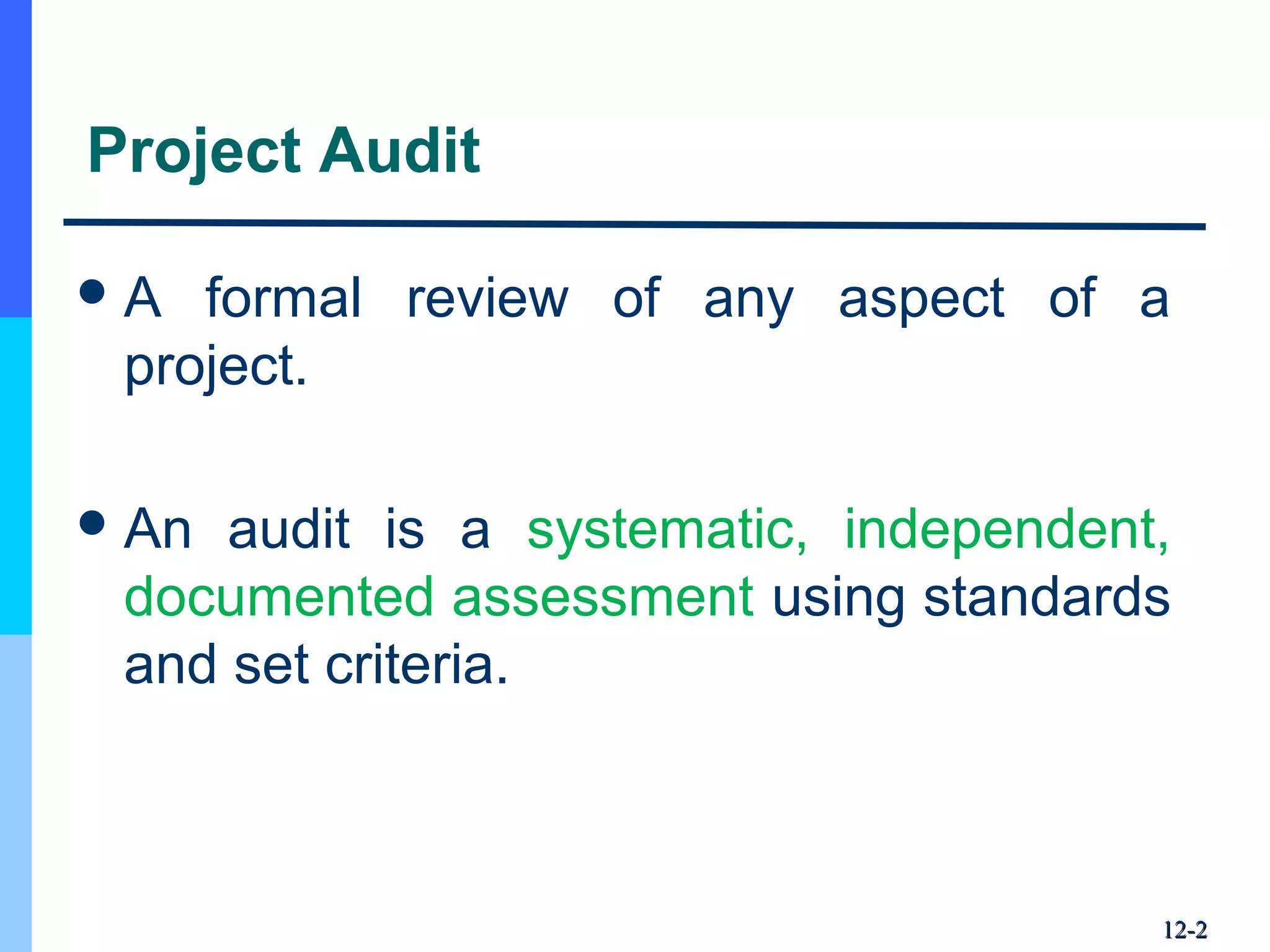 A project audit is a formal review aimed at assessing various aspects of a project such as management, methodology, and budgeting. It identifies strengths and weaknesses, provides recommendations, and aims to enhance customer satisfaction and future project success. The audit process includes different types, phases, and responsibilities, focusing on uncovering issues to improve project management performance.