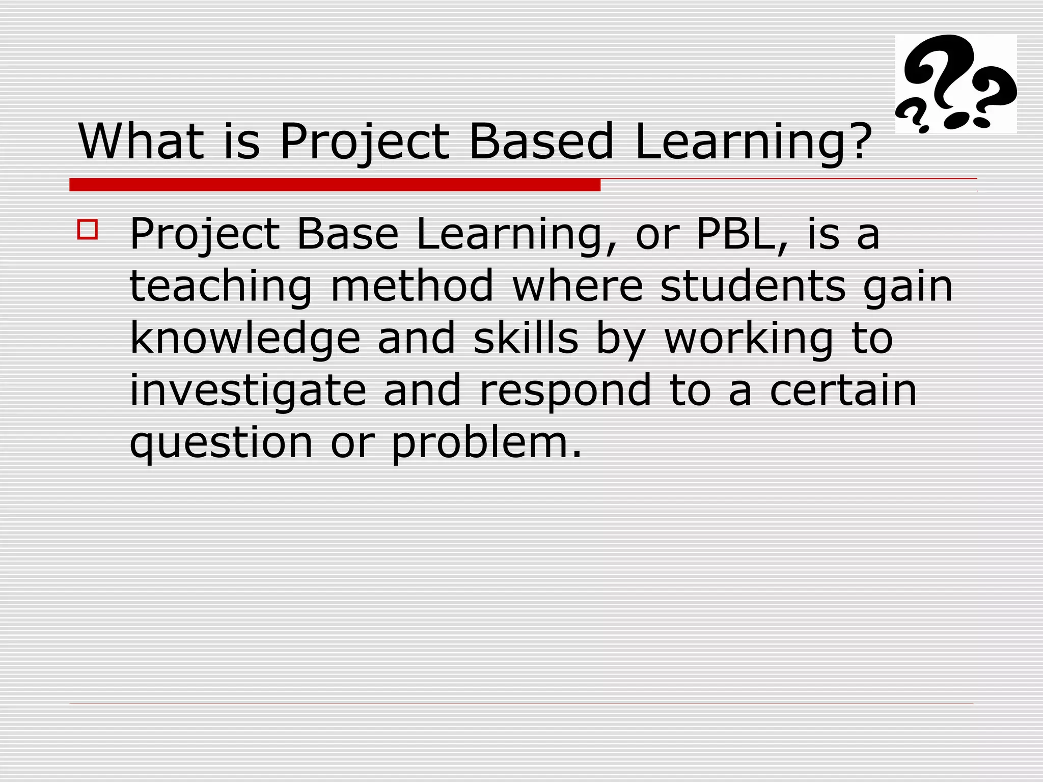 Project Based Learning (PBL) is a teaching method where students investigate and respond to a question or problem to gain knowledge and skills. An example for first grade students is a project on animals in different climates and environments. Students choose an animal and create a video reporting on how their animal survives in its environment. They research the animal's classification, habitat, endangered status, diet, adaptations, lifespan, and three interesting facts. Students also research their animal's climate and create a backdrop for their video report. The goal is for students to have fun while learning through an engaging, interactive, and motivating project.