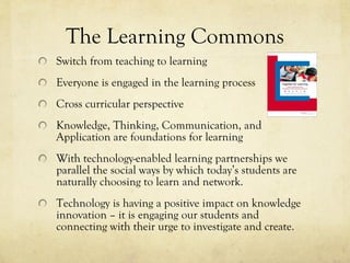 The document discusses project-based learning and its integration with technology in education, emphasizing a shift from teaching to learning. It highlights the importance of inquiry-based learning and the role of school libraries in facilitating knowledge construction through creative opportunities. Various project ideas, tools, and assessment methods are outlined, showcasing how students can engage in meaningful learning experiences.