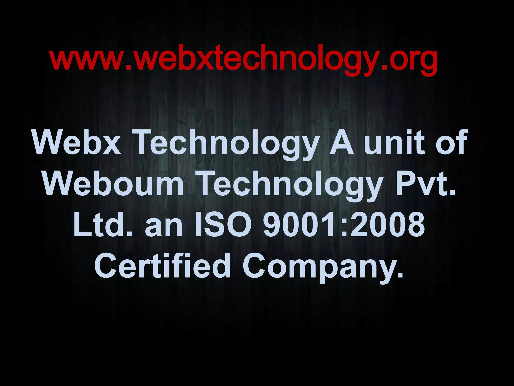 WebX Technology, a unit of Weboum Technology Pvt. Ltd., offers various training programs including PHP, Android, Java, Animation, Software Testing, Web Designing, and SEO training in Chandigarh. The company is ISO 9001:2008 certified and focuses on project-based training with a strong emphasis on hands-on experience. Their trained instructors aim to provide comprehensive education in their respective fields to ensure student success.