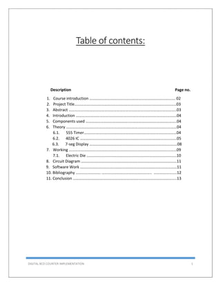 This document describes the design and implementation of a 0-99 digital BCD counter circuit. The circuit uses a 4026 IC and 7-segment displays to display the count. It can operate in two modes - manually using a switch or automatically using a 555 timer as a clock. The circuit was designed, simulated in Proteus, built on a breadboard, and tested to meet the criteria of counting from 0-99 on two displays.