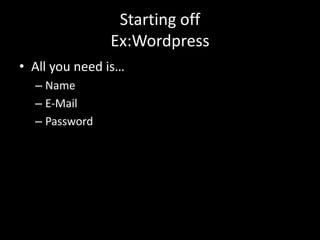 The document provides instructions on how to build a blog. It defines what a blog is, who blogs, and types of blogs like corporate blogs and microblogging. It suggests content ideas for blogs like news, updates, and information. It also discusses choosing a blogging website based on factors like user friendliness, cost, and accessibility. Finally, it gives steps to get started with a blog using Wordpress, including making posts, pages, categories, and editing appearance.
