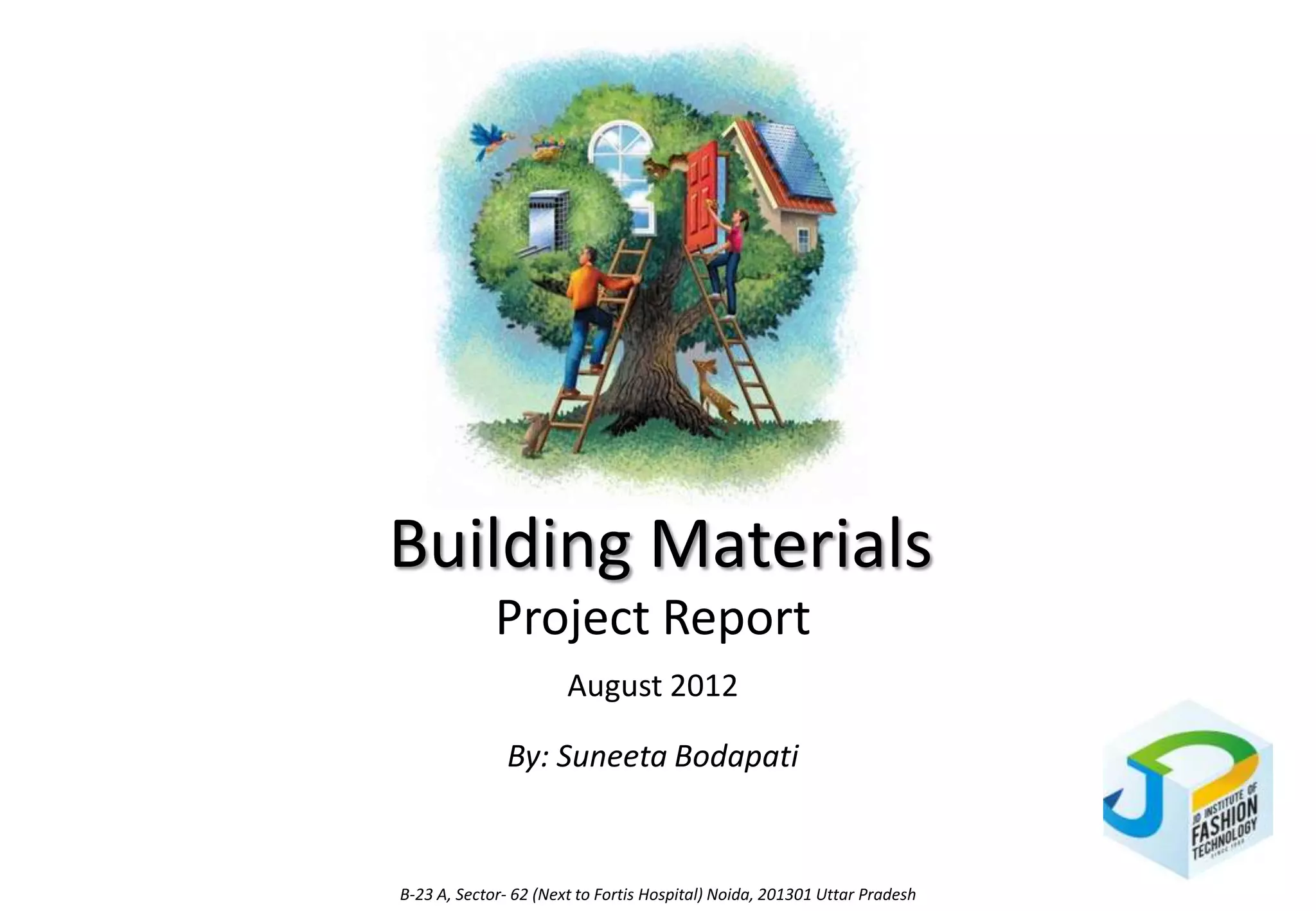 The document provides information on various types of building materials, including glass. It discusses flat glass used in windows and mirrors, laminated safety glass which holds broken glass together, glass building blocks used in wall construction, tempered safety glass which breaks into small dull pieces, colored structural glass used as building exteriors and interiors, opal glass which scatters light, and fiberglass used for insulation and composites.