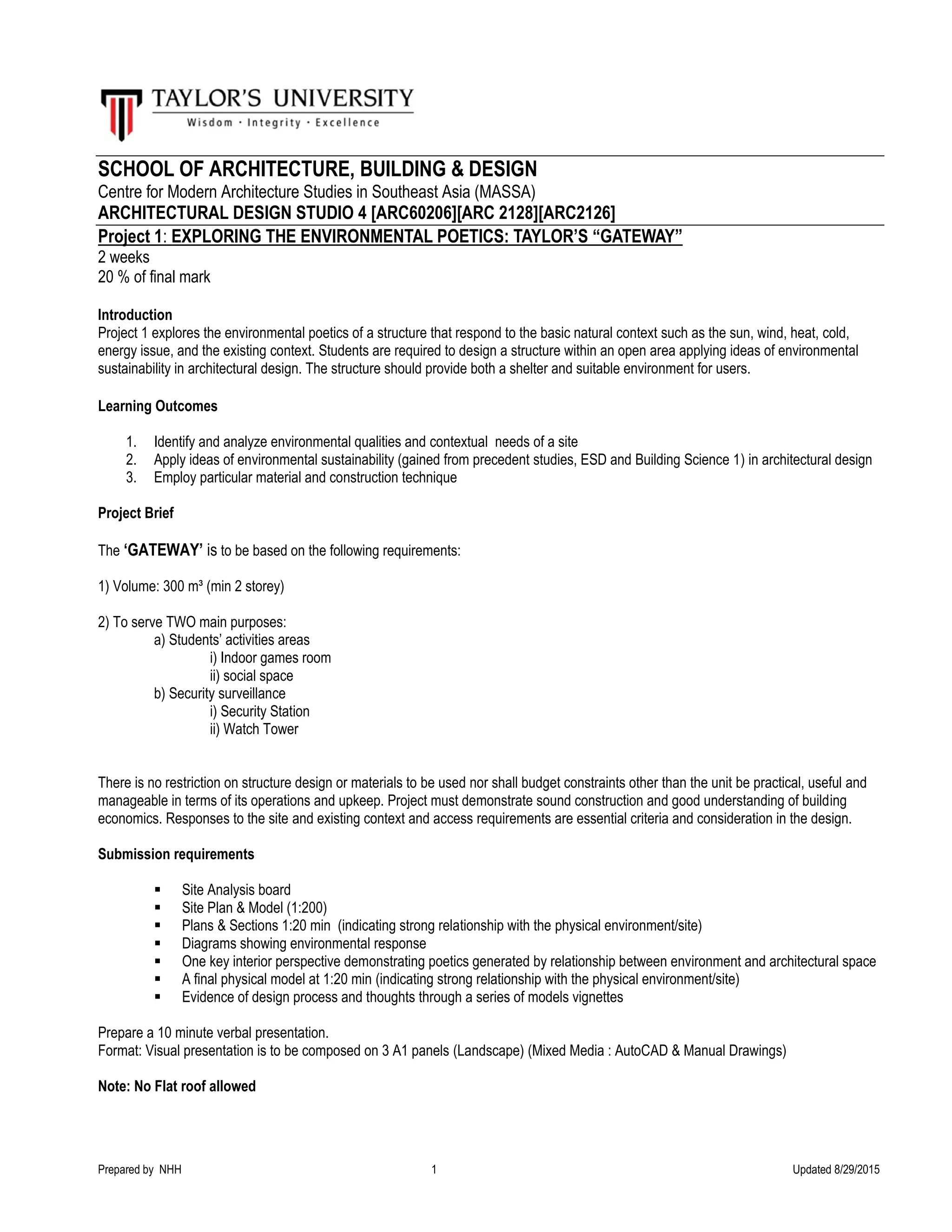 This document provides the project brief for an architectural design studio assignment. Students are tasked with designing a 300 cubic meter structure with two purposes: an indoor games/social space and a security station/watch tower. The structure must be located in an open area on Taylor's University Lakeside Campus and demonstrate environmental sustainability and response to the site context through its design. Key considerations include the structure's relationship to the sun, wind, heat, cold and existing site features. Students must submit site analysis, plans, sections, diagrams and a physical model showing their design's environmental poetics and response to the natural environment.