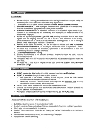 1. This document outlines the objectives, tasks, methodology, submission requirements, and assessment criteria for Project 2 of the Building Construction 2 course. The project involves understanding forces in building construction.