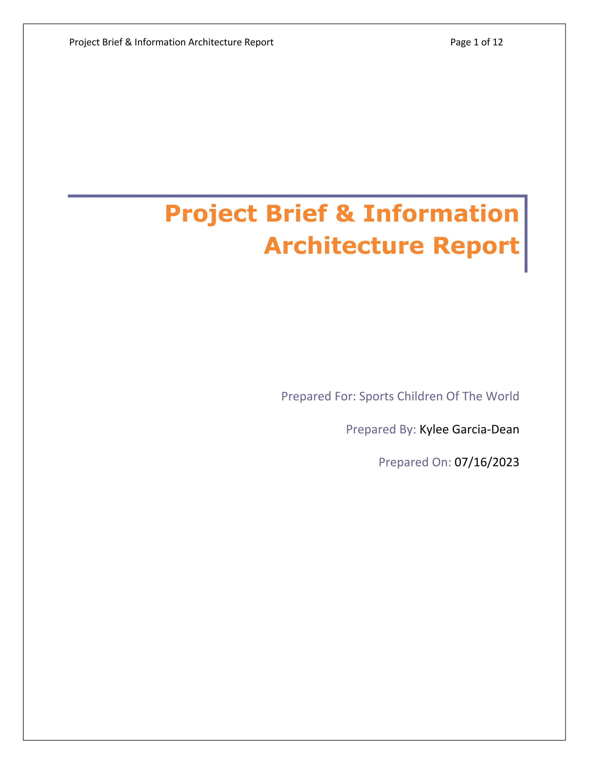 The document is a project brief and information architecture report for Sports Children of the World, a donation-based organization that provides sports equipment to children globally. It outlines the objectives, target audience, competitive analysis, current site review, and proposed improvements for the organization's website, emphasizing the need for a more user-friendly and modern design. Key recommendations include the addition of a donation button, a newsletter, and an updated content strategy to enhance engagement and effectiveness.
