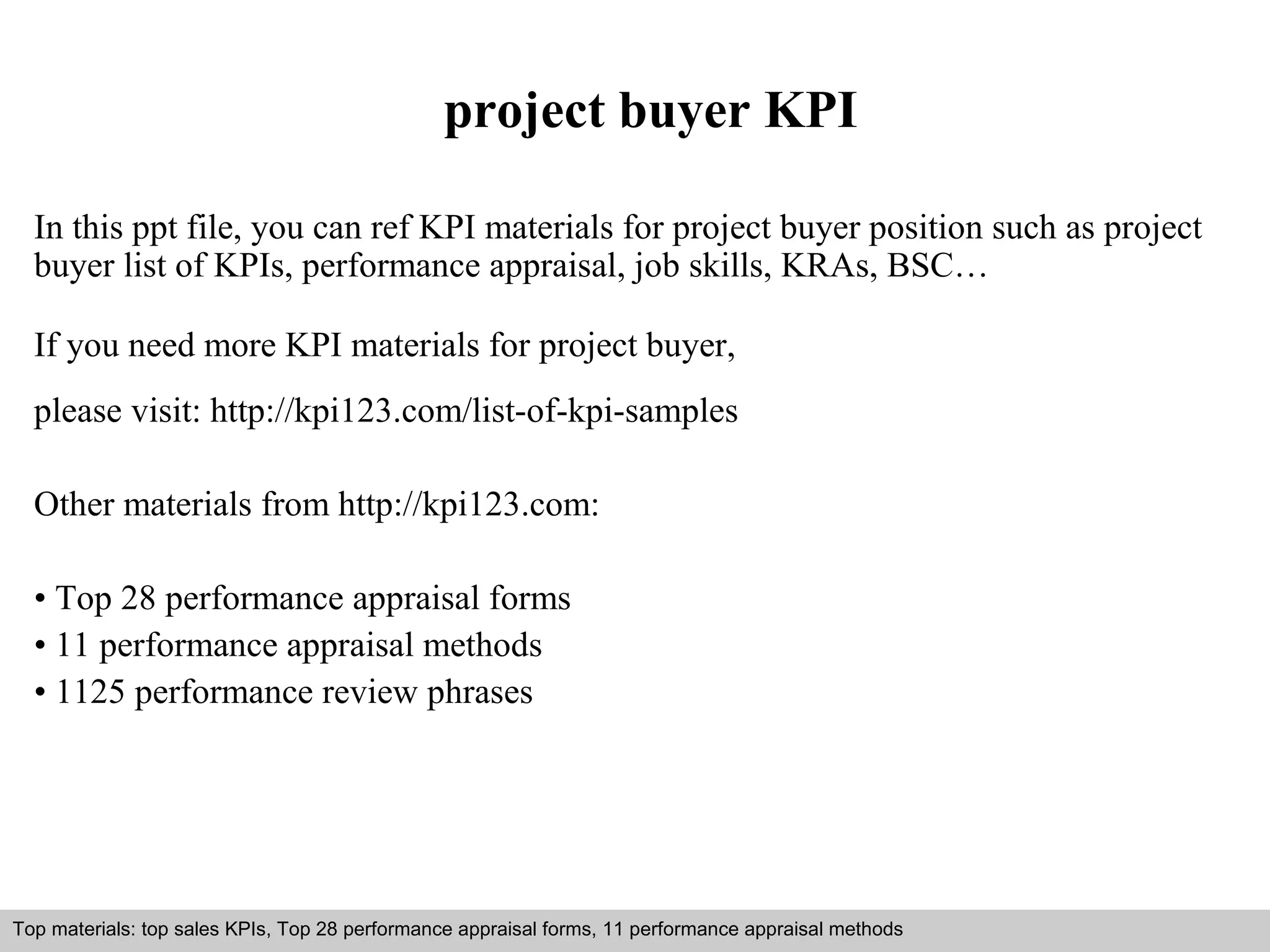 The document discusses key performance indicators (KPIs) for a project buyer position. It provides information on developing KPIs for a project buyer, including defining objectives, identifying key result areas and tasks, and determining how to measure results. The document also lists common types of KPIs and cautions against creating too many KPIs or ones that do not change based on goals. Additional KPI materials can be found on the listed website.