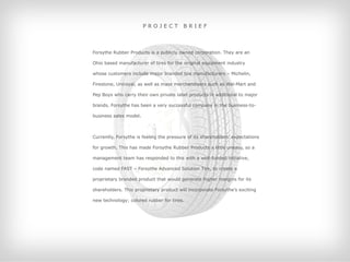 Forsythe Rubber Products is developing a proprietary branded tire called FAST to generate higher margins. The project is to design a brand that changes how people think about tires through an integrated product, brand, and retail experience. Three reframe concepts were proposed: Chameleon uses subtle colored rubber accents to communicate maintenance needs, ColorWorks uses a three-tier colored rubber system to indicate tread wear and issues, and Spectrum uses different colored rubber bands and RFID chips to differentiate tire types and directly alert users to problems.