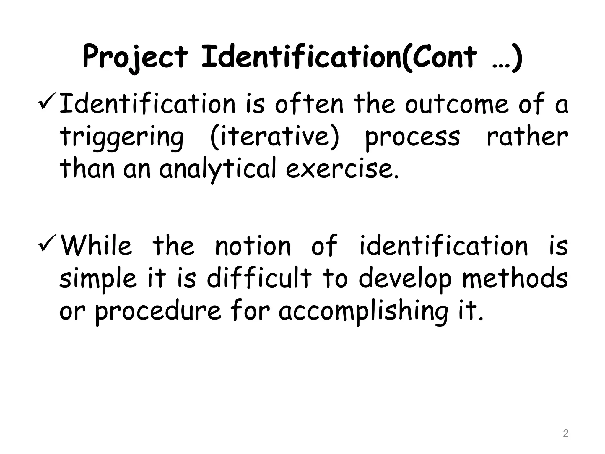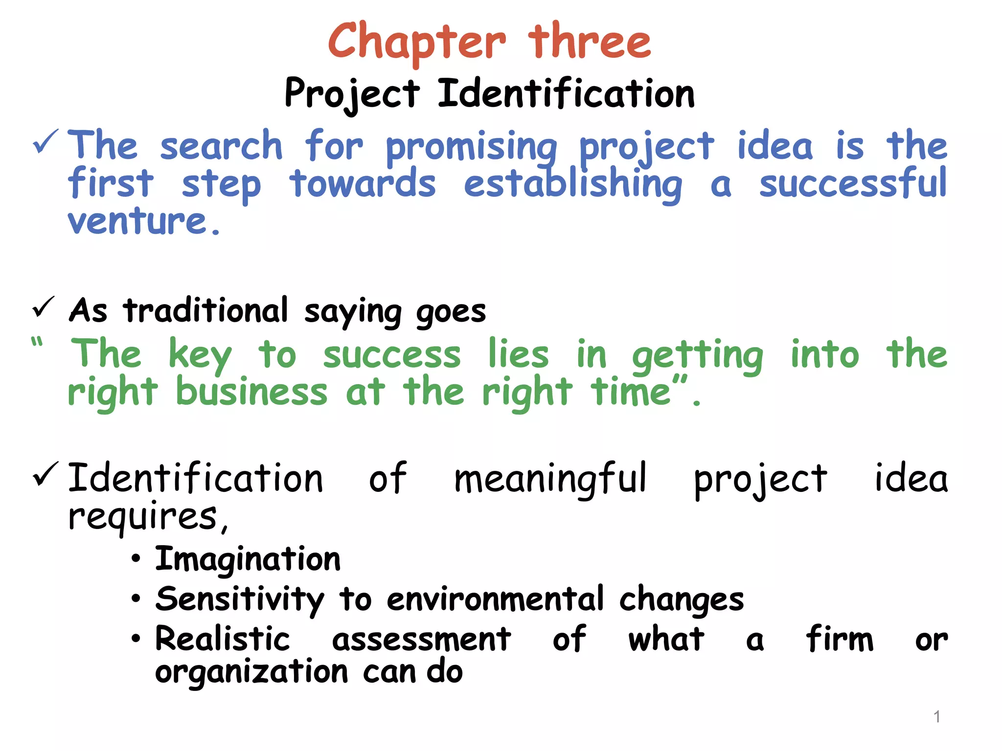 This document outlines the process for identifying new project ideas. It discusses that the first step is generating ideas through techniques like SWOT analysis and defining clear objectives. Then, ideas are monitored based on factors like the economy, policies, technology and competition. A self-assessment evaluates the organization's strengths and resources to screen ideas. Preliminary screening examines compatibility, government priorities, inputs and risks. Finally, a project rating index assigns weights and ratings to factors to quantitatively score and compare ideas. The highest rated ideas are selected to further develop into potential new projects.