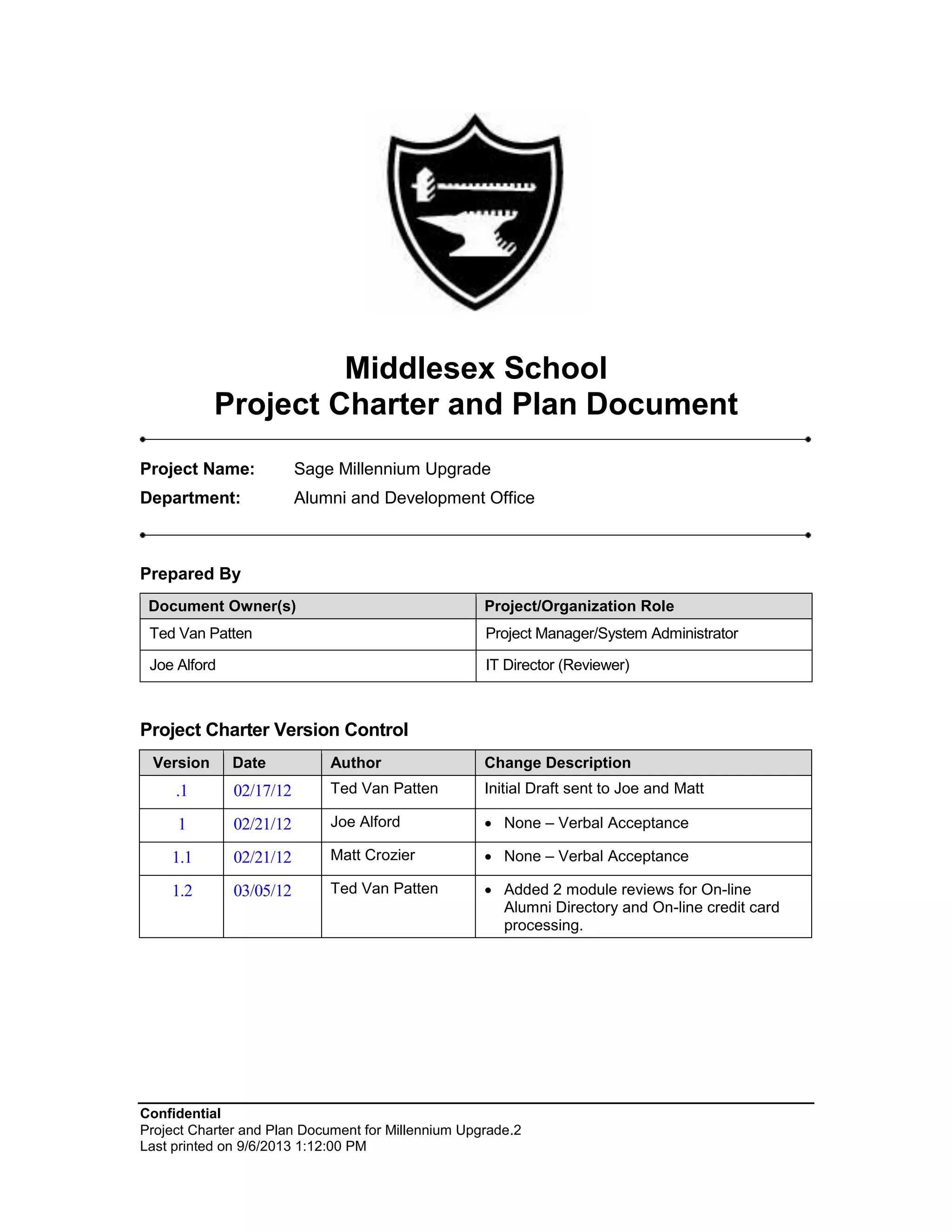 The document provides a project charter and plan for upgrading Middlesex School's Sage Millennium fundraising software from version 7.7 to 7.9 Service Pack 2. The project has 7 phases: 1) planning, 2) analyzing the current system, 3) implementing and testing a new system, 4) reviewing new functionality, 5) training users, 6) going live with the new system, and 7) optimizing post go-live. The project aims to have the new system online by the end of the fiscal year on July 15, 2012.