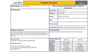 The project aims to improve the process quality of an associates team which has dropped below the 95% SLA to 92% over the last 4 months. The goal is to achieve over 95% monthly quality. Stakeholders include the Vice President as Champion, Assistant Vice President as Sponsor. The project will focus on associates in production from October 2010, and follow a DMAIC methodology from June 2010 to December 2010 to define, measure, analyze, improve and control the process.