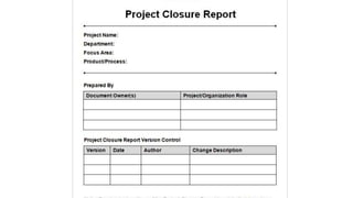 The document discusses the project closure process, which includes formal closure of the work, handing over final project results and verification. It describes the inputs, methods and outputs of closure such as collecting documentation, analyzing success and failures, gathering lessons learned, finishing contracts, and creating a document of formal closure. The closure process also involves administrative and archiving tasks like closing accounts, defining the reason for closure, and storing project documentation.