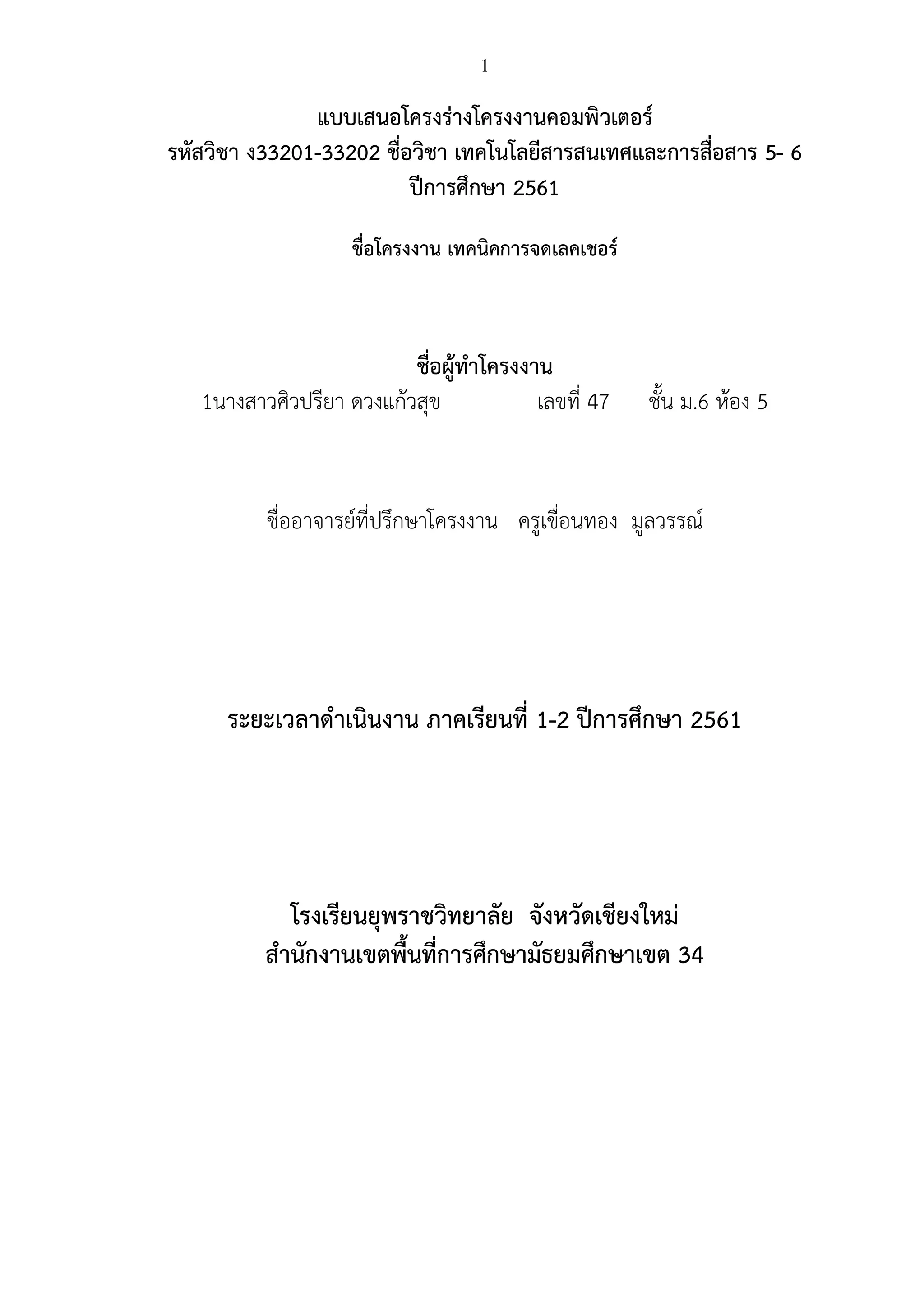 เทคโนโลยีสารสนเทศและการสื่อสาร 5- 6 ปีการศึกษา 2561 ชื่อโครงงาน เทคนิคการจดเลคเชอร์ ชื่อผู้ทาโครงงาน 1นางสาวศิวปรียา ดวงแก้วสุข เลขที่ 47 ชั้น ม.6 ห้อง 5 ชื่ออาจารย์ที่ปรึกษาโครงงาน ครูเขื่อนทอง มูลวรรณ์ ระยะเวลาดาเนินงาน ภาคเรียนที่ 1-2 ปีการศึกษา 2561 โรงเรียนยุพราชวิทยาลัย จังหวัดเชียงใหม่ สานักงานเขตพื้นที่การศึกษามัธยมศึกษาเขต 34