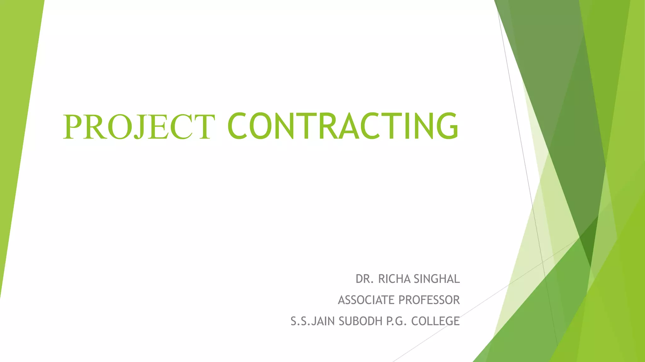 The document outlines project contracting, defined as the legal agreement between owners and contractors for executing project work. It describes the steps involved in forming project contracts, the various types of contracts such as fixed price, cost plus, turnkey, and concessional contracts, and highlights the importance of negotiation and contract administration for successful project execution. Key processes include bidding, contract signing, and ensuring compliance with contractual commitments.