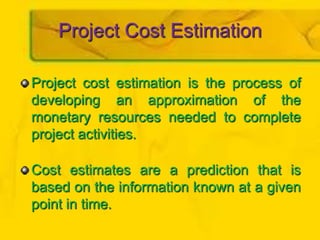 The document discusses three key processes for managing project costs: cost estimating, cost budgeting, and cost control. It provides details on cost estimation methods like analogous estimating and three-point estimating. Cost budgeting involves setting a cost baseline budget. Cost control tools like earned value management measure planned vs. actual costs and schedules to identify variances enabling corrective actions. Earned value charts and calculations like CPI and SPI are used to forecast final costs and identify if projects will finish over or under budget.