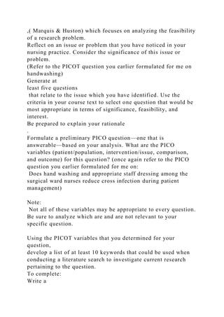 The document outlines the process of formulating a research question in evidence-based practice (EBP) for a nursing project, focusing on the PICOT model. It guides the reader through generating relevant questions, assessing their feasibility, and developing a preliminary PICOT question. Additionally, it emphasizes the importance of conducting a literature review to support the selected research question.