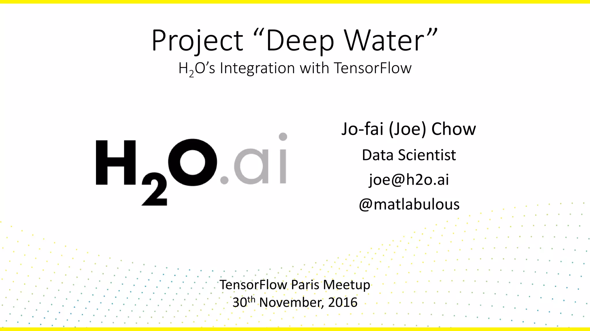 The document presents Project Deep Water, which integrates H2O.ai's open-source machine learning platform with TensorFlow to facilitate distributed deep learning. It includes an overview of TensorFlow's capabilities, benefits of H2O.ai, and live demonstrations of deep learning applications using both platforms. The combination aims to streamline model building, training, and deployment while democratizing access to AI and big data science.