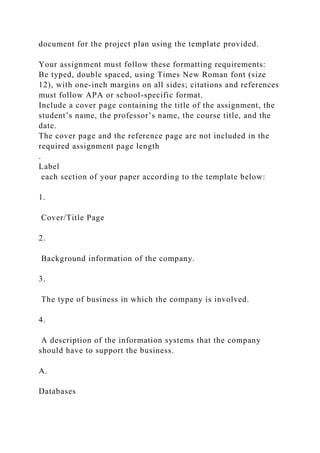 The document outlines the project plan for an innovative e-commerce start-up company, emphasizing the need for a comprehensive information technology (IT) infrastructure in a new facility. It includes details on creating business requirements, Gantt charts, database schema design, infrastructure layout, and security policies, all of which will culminate in a final project deliverable to be presented to executives and investors. The project aims to support the company's growth from $5 million to $30 million in revenue over two years, requiring careful integration of various technologies and best practices.