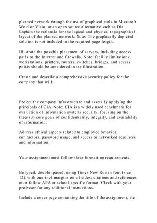 The document outlines a project assignment focused on creating a network infrastructure and security policy due in week 8, consisting of two parts: an infrastructure document and a revised project plan. The infrastructure document should identify vulnerabilities and present a topographical layout while addressing security measures, specifically incorporating virtualization and cloud technology, following the CIA principles. The revised project plan requires updating previous tasks with new elements related to technology implementation and process improvement.