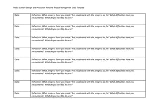 The document outlines progress on a personal video project over several months. In September and October, market research was conducted on successful YouTube tutorials to identify best practices. In November, planning was completed for the content and structure of the tutorial video, and work began on the thumbnail. In December, editing of the tutorial began at a careful pace to avoid mistakes, with the goal of completing the video over the next few months while periodically checking progress. Copyright-free music is also being identified to avoid legal issues. The document contains empty sections for ongoing reflection on progress, difficulties, and next steps.