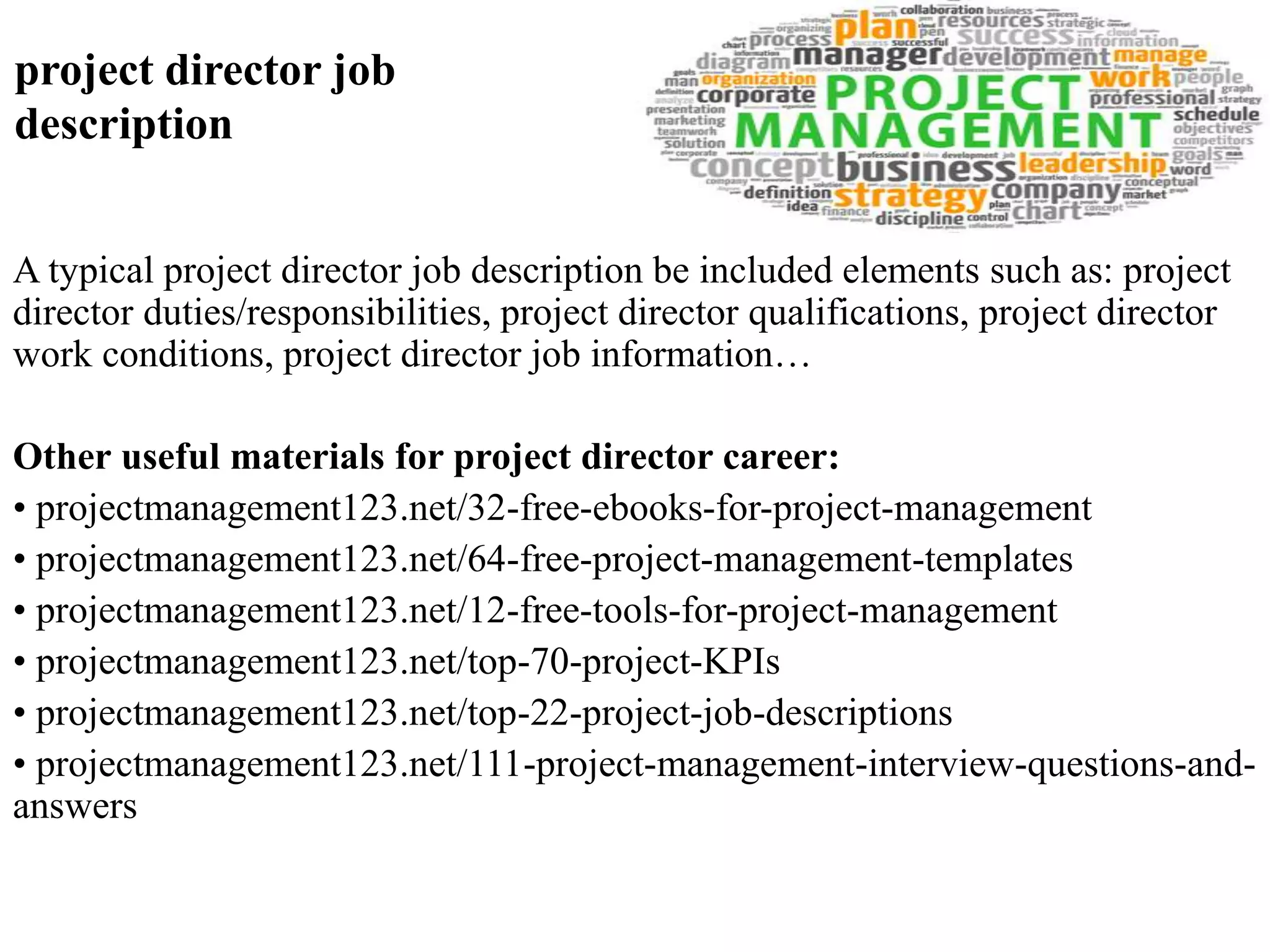 The document outlines the typical job description for a Project Director, detailing key duties such as strategy development, campaign coordination, staff support, and budget management. It also specifies qualifications required for the role, including educational background, experience in healthcare project management, and strong communication skills. Additionally, it provides useful resources for career development in project management.