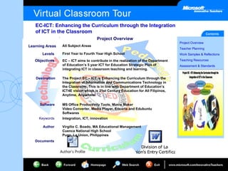 The document describes a project called EC-ICT that aims to integrate information and communications technology (ICT) into classroom teaching and learning at Cuenca National High School in the Philippines. The project supports the Philippine Department of Education's strategic plan and vision to provide 21st century education to all Filipino students anytime, anywhere. It involves using software like MS Office, movie maker, and Edubuntu across all subjects for first to fourth year high school students. The document includes sections on teacher planning, classroom images using ICT, work samples, teacher and student reflections, ICT lesson plans, teaching resources, and assessment tools aligned with national ICT standards.