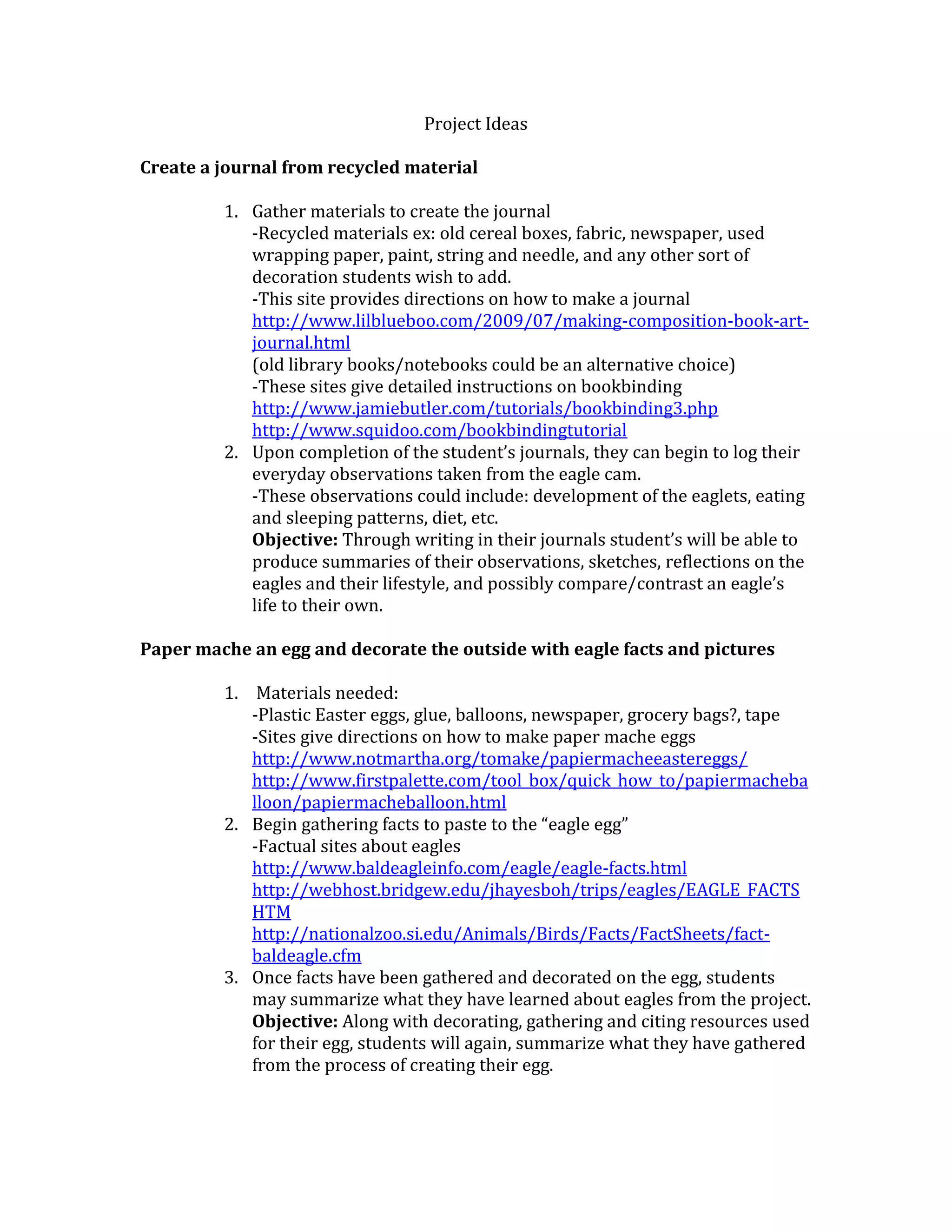 1) Create a journal from recycled materials to record observations of eagles from a live cam.