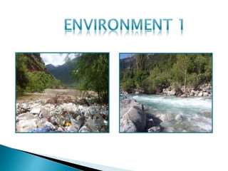 1 picture: In the first picture we can see a mighty healthy river surrounded by trees, but in the next picture we can see as the river has turned dirty by the trash that people thrown into the river. 2 picture: This picture is the result of the warming global effect. In the first photo, taken in 1928, it is considerable to see a frozen glacier with mountains covered of snow, but in the next photo, taken in 2004, we can see how the ice has defrosted and become water, due to rising temperatures. 3 picture: First of all we can observed a mountain high enough, it contains some snow whereas in the second photo we see the same picture but this time without snow, since has been dissolved. 4 picture: Finally we see a black and white image of a mountain, in this picture you can observed some mountains on bottom of the picture while in the picture below you can see how the mountains have become blocks of flats due to globalization. Conditionals One regret: If people weren't so dirty and they didn't throw trash in the river, rivers would be so much clean. One hypothesis: If humans keep our ecosystem clean by using less our cars, the ozone layer won't warm and pole systems won't defrost. One prediction: If we keep damaging the environment, in a near future we won’t have our trees, our rivers and our fields.