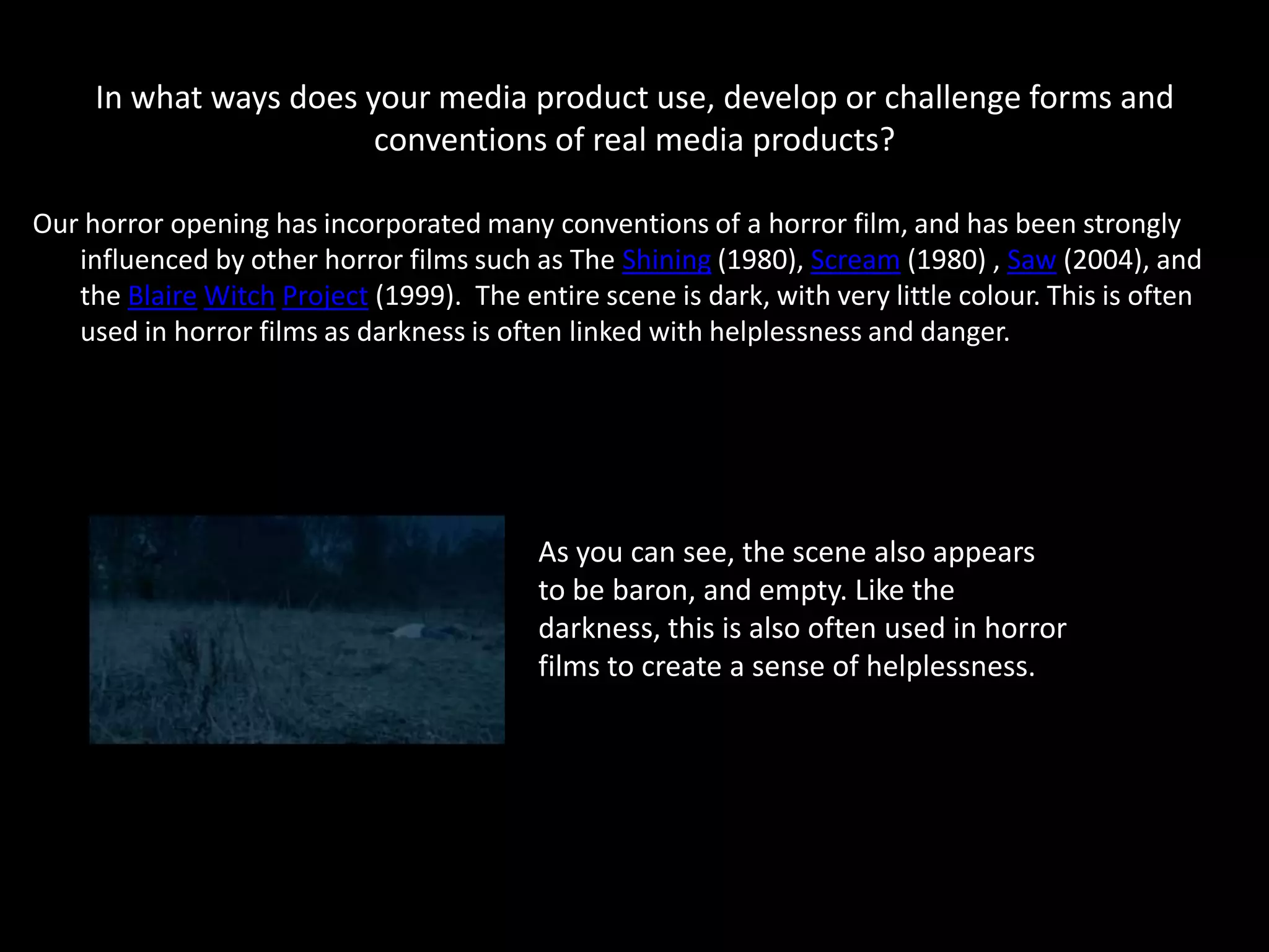 The document discusses conventions used in the opening scene of a horror film project. It begins by outlining conventions incorporated from other horror films like The Shining, Scream, Saw, and The Blair Witch Project. Darkness, emptiness, innocent/mysterious protagonists and antagonists are used. Unsteady camera shots are also included to mimic the "home movie feel" of Blair Witch. The opening introduces the antagonist, builds suspense, and raises questions like other horror films. It represents males in the roles of both victims and killer, challenging typical female victim stereotypes. The intended audience is described as teenagers and young adults seeking thrills.