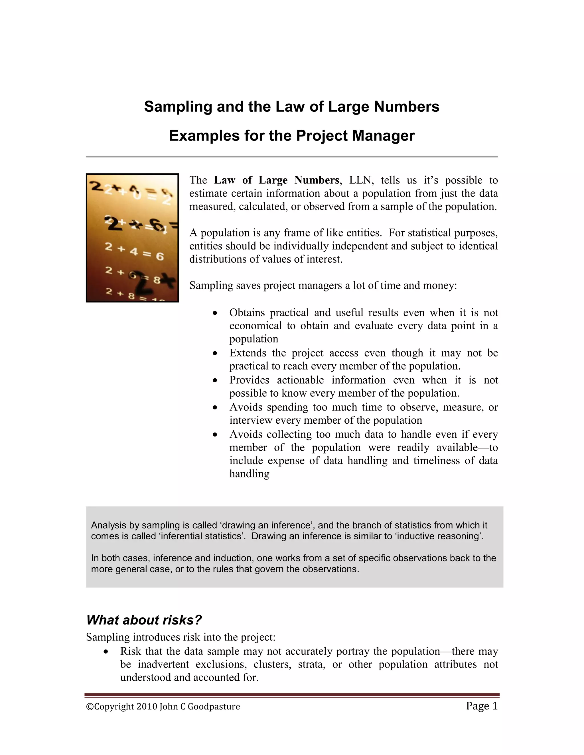 The document discusses sampling techniques and how they can be used to estimate parameters about a population. Specifically, it provides examples of how sampling can be applied to estimate proportions and continuous data for project management purposes. The key aspects are estimating proportions and descriptive statistics like averages from a sample to help with tasks like scheduling while managing the risk that the sample may not perfectly represent the entire population. Guidelines are provided for determining appropriate sample sizes to achieve desired confidence levels and margins of error.
