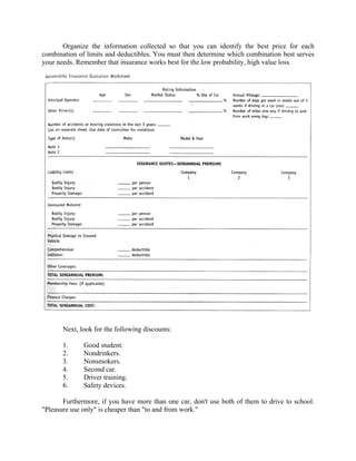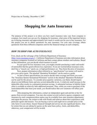 The document provides instructions for a project on obtaining auto insurance quotes. Students are asked to get quotes from 5 companies and report the financial ratings for each. They should choose the best coverage for their needs and explain their decision. A copy of the chosen policy is required, along with answers about coverage, exclusions, rights/obligations. The most important lesson learned about auto insurance should also be reported.