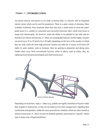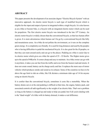 This paper presents the development of an associate degree program in "Electric Bicycle Systems". An electric bicycle uses an integrated electric motor to provide propulsion assistance to the rider. It allows riders to travel longer distances with less effort than a conventional bicycle. The first electric bicycles were introduced in the late 19th century. Modern electric bicycles can travel up to 32 km/hr and are gaining popularity as an environmentally friendly transportation option. This paper discusses the history and components of electric bicycles and outlines the proposed associate degree program.