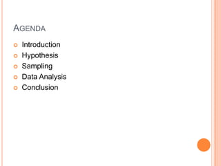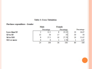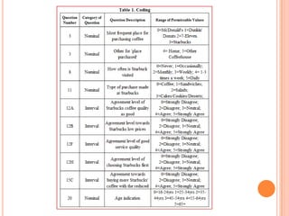 [2] Surveys were conducted with 60 coffee-drinking students ages 16-24. Results were analyzed using simple tabulation, cross-tabulation, and t-tests to test the hypotheses.