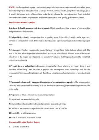 The document outlines key characteristics of projects, emphasizing their unique, temporary nature and the importance of delivering specific results within set constraints. It details the contents of a detailed project report, types of project finance, and the roles of demand forecasting and feasibility analysis in project planning. Additionally, it discusses various risks associated with projects and the economic appraisal necessary to assess the overall impact on economic welfare, highlighting the distinction between financial and economic values.