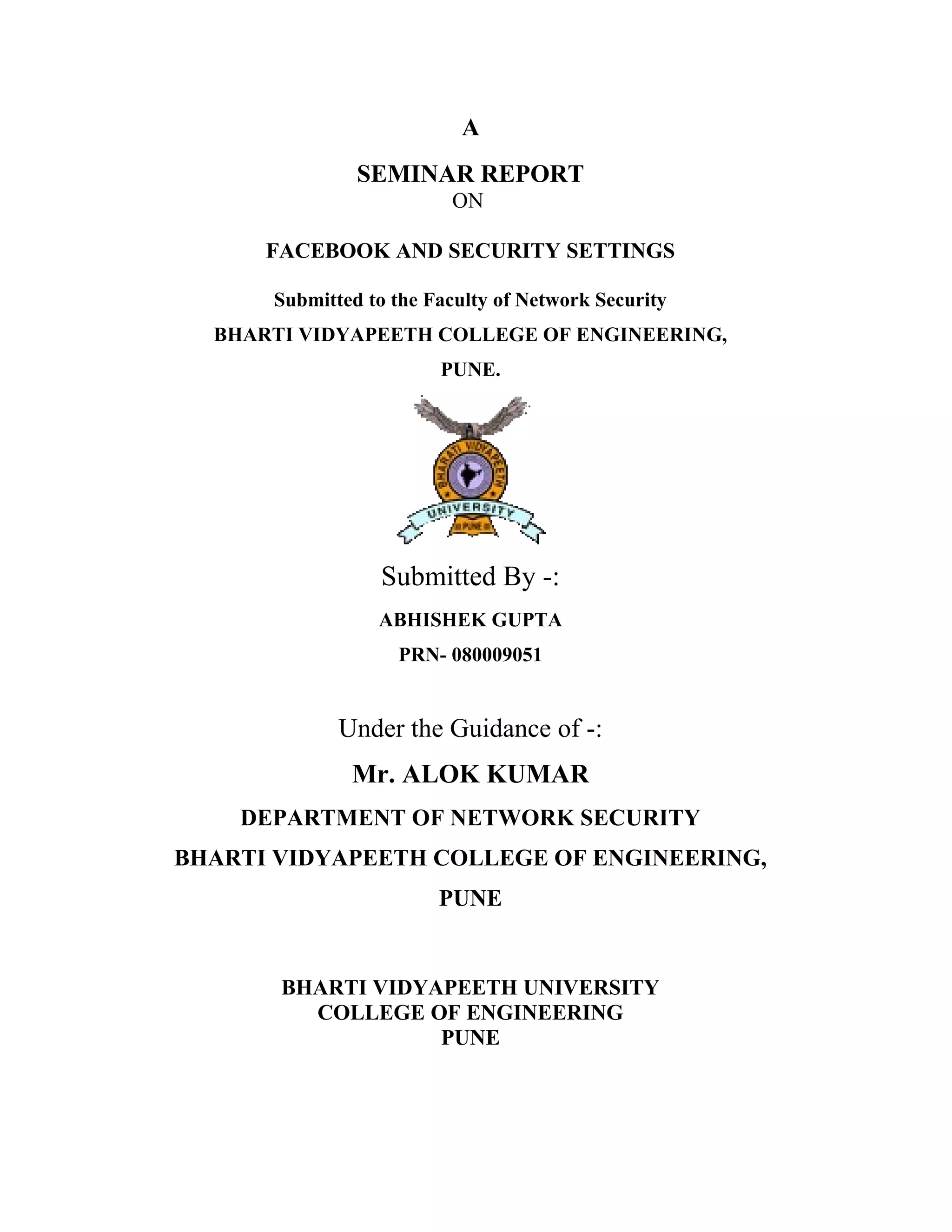 This document is a seminar report submitted by Abhishek Gupta to his faculty on the topic of Facebook security settings. It provides an overview of Facebook and its history and growth. It then details various Facebook security settings that users can configure to help protect their privacy and security, such as using secure browsing, adjusting privacy settings, enabling login approvals and notifications, opting out of facial recognition, and removing information from social ads. The report provides step-by-step instructions for configuring these various security settings on Facebook. It concludes with some additional security considerations for Facebook users.