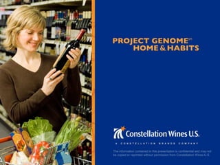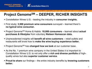 This document from Constellation Wines U.S. summarizes their Project Genome consumer research study, which analyzed survey and purchase data from 10,000 wine consumers to identify 6 key premium wine consumer segments. The segments - Enthusiast, Image Seeker, Savvy Shopper, Traditionalist, Satisfied Sipper, and Overwhelmed - each have distinct preferences, purchase behaviors, and needs from retailers. Constellation hopes this information will help the wine industry better understand customers and improve the wine buying and consumption experience for all.