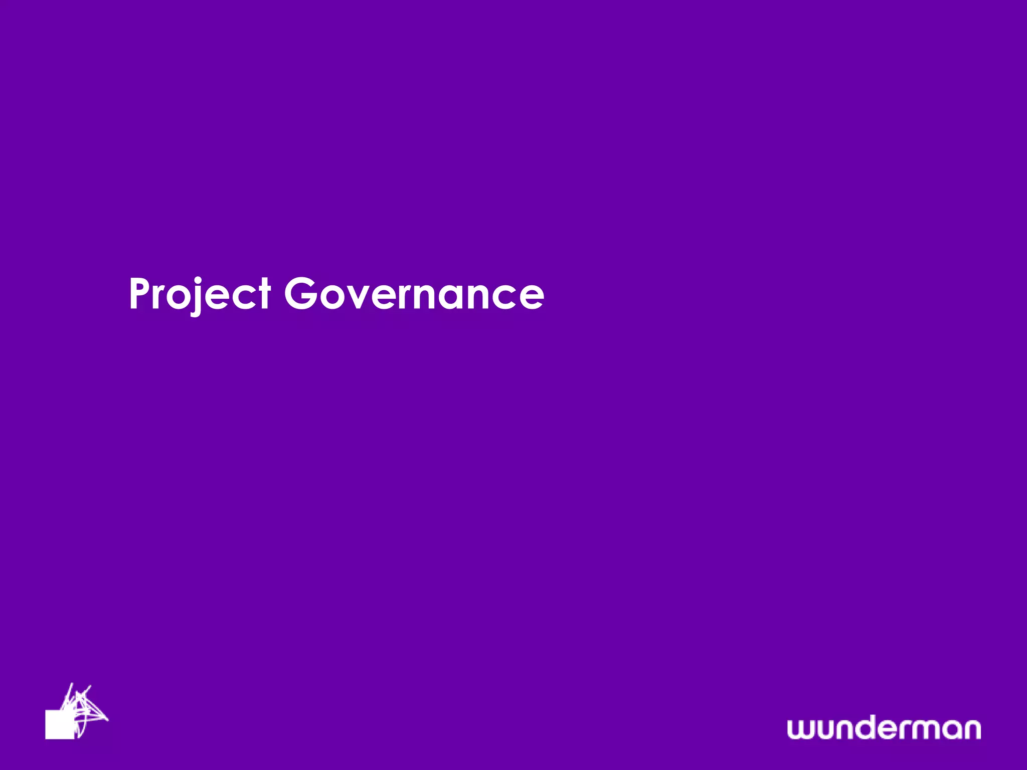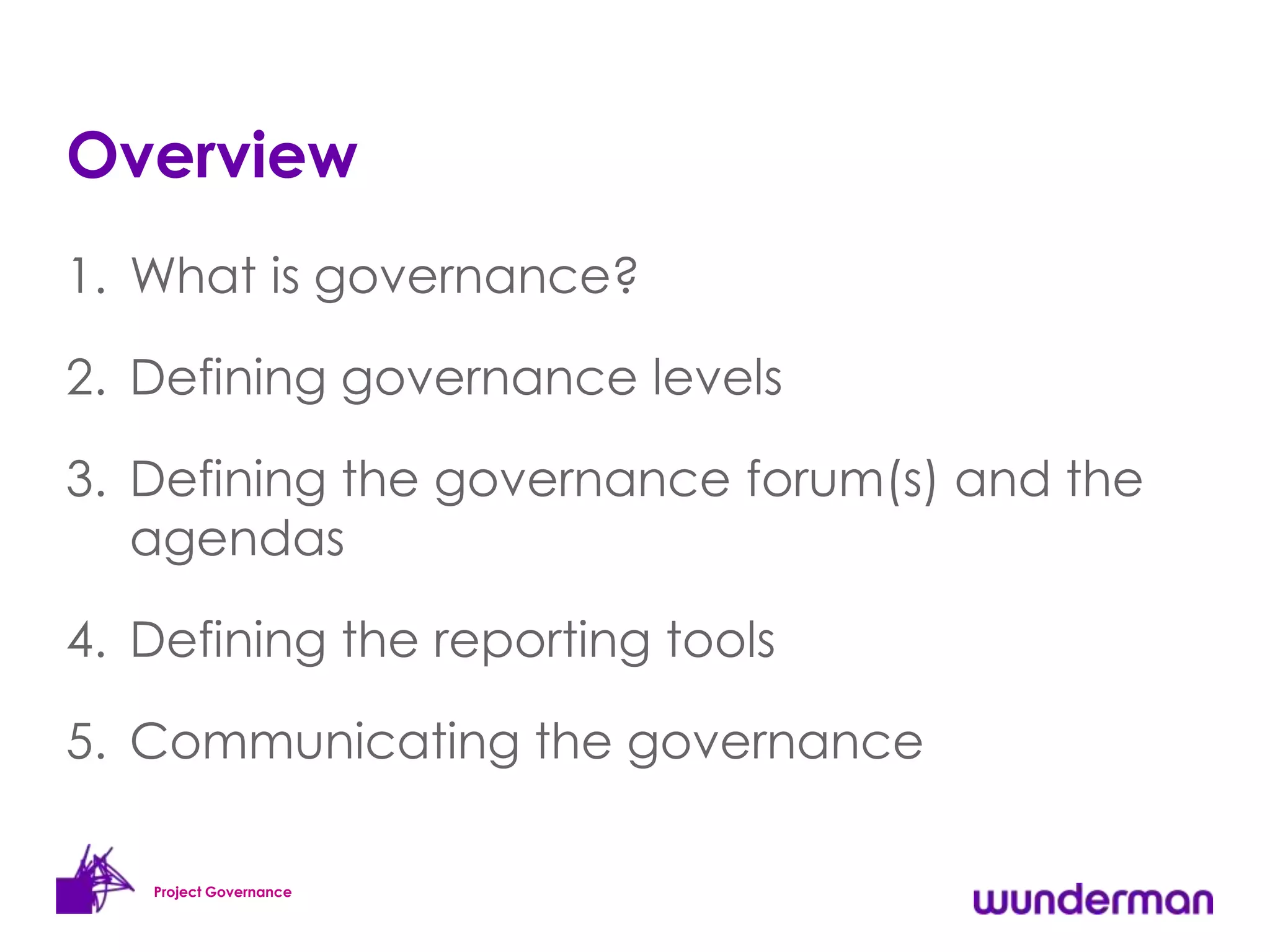 The document discusses project governance and defines what it entails. It recommends defining governance levels by identifying who the project reports to and who needs to deliver work for the project. It also recommends defining governance forums like daily scrums, weekly project review board meetings, and monthly executive board meetings. The document advises defining the reporting tools needed to track deliverables, assumptions, risks, issues, changes, milestones, and budget. It stresses the importance of communicating the governance structure to ensure everyone understands their roles and responsibilities.