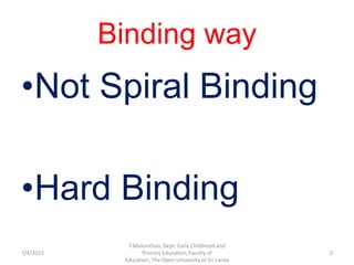The document provides instructions for preparing a project on early childhood education. It specifies the paper size and formatting should be A4 size, landscape orientation with margins of 1.25 inches on the left, 1 inch on the right, and 0.75 inches on the top and bottom. The text should be typed in Times New Roman 14 point font for chapter titles and 12 point font for subtitles. The project should include chapters on topics like child development, language development, mathematics skills, and health and nutrition, with each chapter outlining several relevant concepts and activities. Photographs can be included on pages facing the written text.