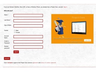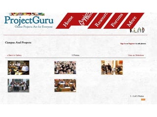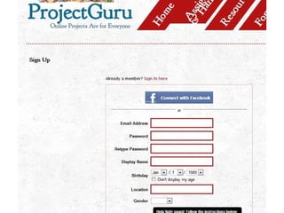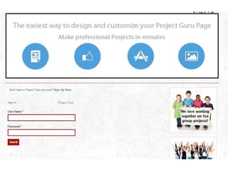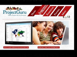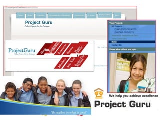 Project Guru aims to provide guidance to students on their school projects and assignments by helping them with time management, optimal resource utilization, and external support to relieve stress and ensure multilevel learning with less effort. The document outlines Project Guru's value proposition, target customer segment of students aged 10-18 and their parents, and marketing strategy which includes direct marketing, online marketing, viral marketing, and experiments in advertisements, word of mouth promotion, social media pages, email campaigns, and public listings.