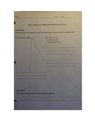 This document outlines a project to help people in need by providing research questions to guide the development of the project. It asks the reader to look for similar online projects, and suggests developing a slogan, description, pictures or sketches, actions, and contact information for the project. It also asks how the project could be improved by again suggesting elements like a slogan, description, pictures, actions, and contact information.