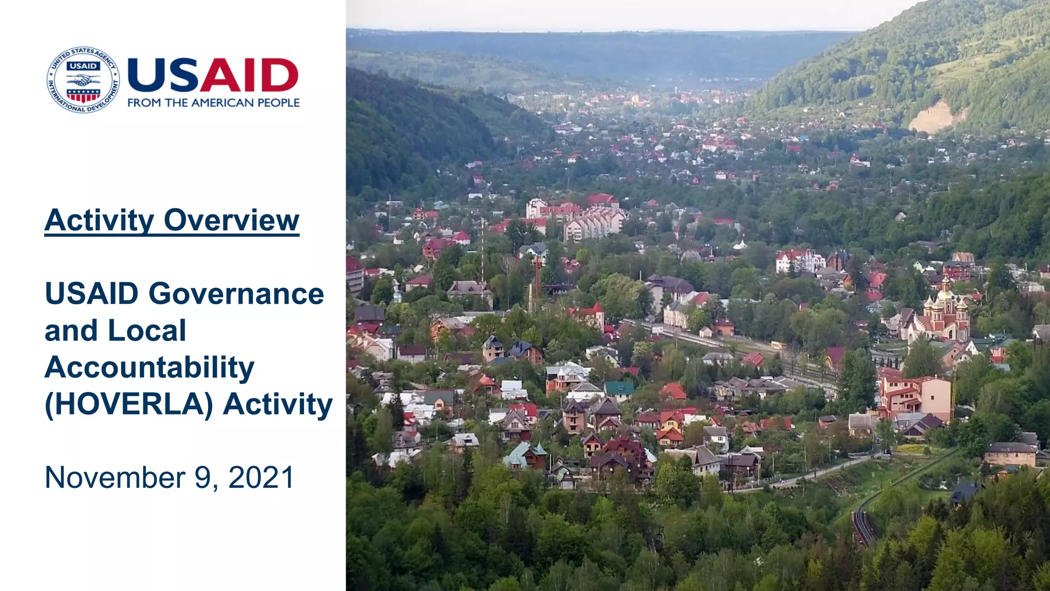 The USAID Governance and Local Accountability (HOVERLA) Activity is a 5-year program funded by USAID and implemented by partners to support Ukraine's decentralization reform agenda and advance self-reliant local governance. Its goal is to institutionalize Ukraine's system of local self-governance, increase self-reliant subnational governance, and improve citizens' role in local governance processes through objectives like policy and legislation reforms, local government capacity building, and civic engagement initiatives. Key stakeholders include various Ukrainian ministries and institutions, civil society groups, and the private sector.