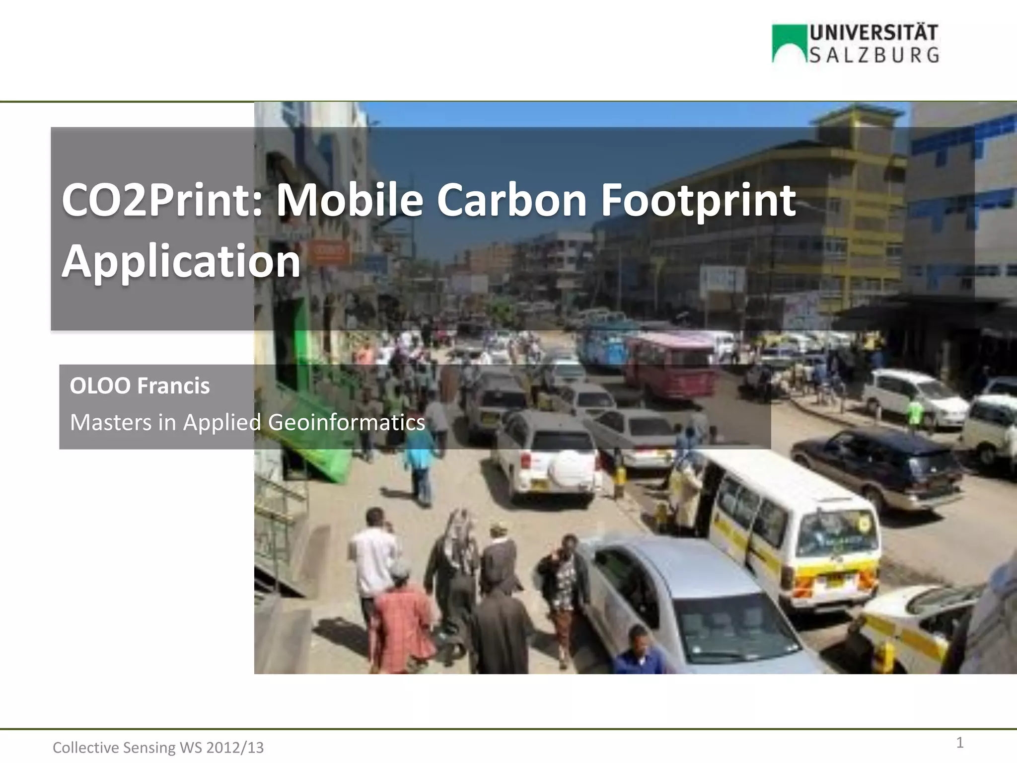The document describes a proposed mobile application called CO2Print that allows users to track their carbon footprint from travel and daily activities. The application would use GPS and conversion factors to calculate carbon emissions from distance traveled by mode of transportation. It would generate summaries and graphs of carbon footprint over time and by activity type. The application could also integrate with social media to create awareness and motivate low-carbon behaviors among friends.