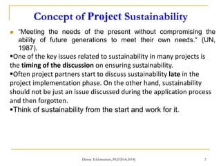 This document discusses project sustainability, exit strategies, and closure. It notes that sustainability should be considered from the start of a project and discusses factors that affect sustainability, such as community participation and demand responsiveness. Regarding exit strategies, it describes project extinction, addition, integration, and starvation. Project closure involves administrative and contractual processes as well as a final report detailing lessons learned, performance, management techniques, and recommendations to improve future projects.
