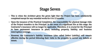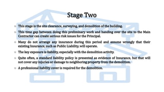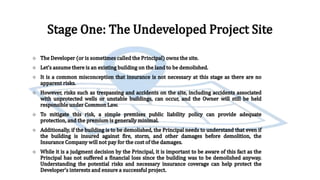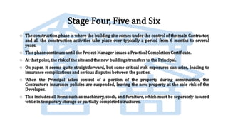 The document discusses various exposure treatments related to construction projects, including physical damage to properties, third-party liabilities, and coverage options. It emphasizes the importance of insurance policies such as contractor's all risk and public liability to handle potential losses and injuries during and after construction. Additionally, it highlights the need for coverage against natural risks and the responsibilities of both owners and contractors in managing these exposures.