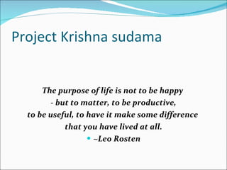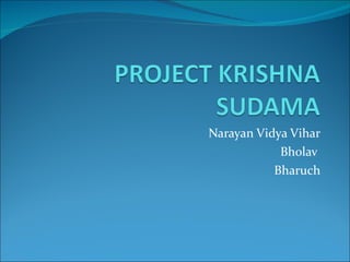 The document describes Project Krishna-Sudama, an initiative of Narayan Vidya Vihar school to help underprivileged tribal children in a nearby ashram. The project aims to develop moral values, equality, and understanding of rural life in students. Each month, students and parents contribute useful items like stationery, clothes, food, and toiletries to meet the needs of ashram children. Over 2000 students and their families willingly participate in this community service project throughout the year to help underserved tribal communities.