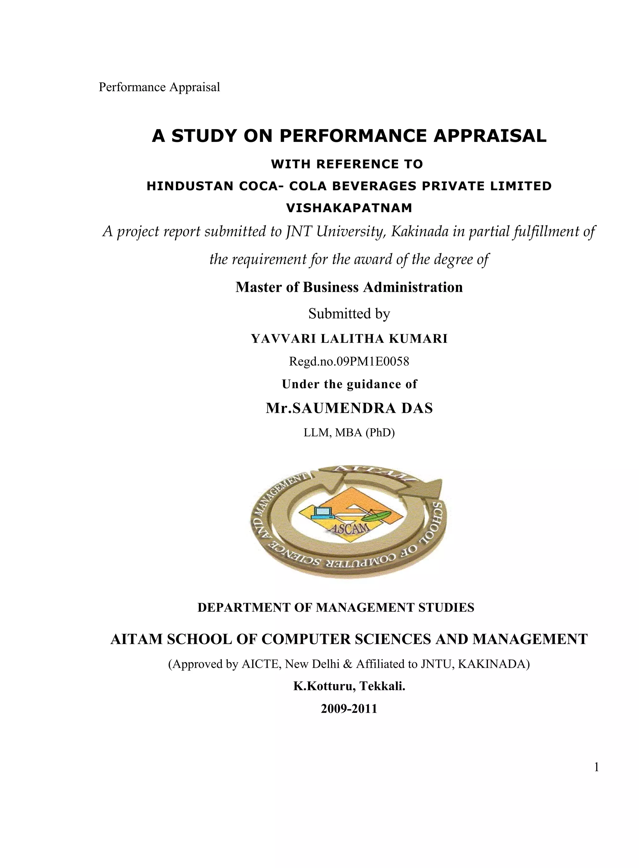 This document appears to be a student project report on performance appraisal at Hindustan Coca-Cola Beverages Private Limited in Vishakhapatnam, India. It includes an introduction outlining the purpose and importance of performance appraisal. It then discusses the objectives, methodology, and limitations of the study. The report will analyze Hindustan Coca-Cola's performance appraisal system and provide findings and suggestions.
